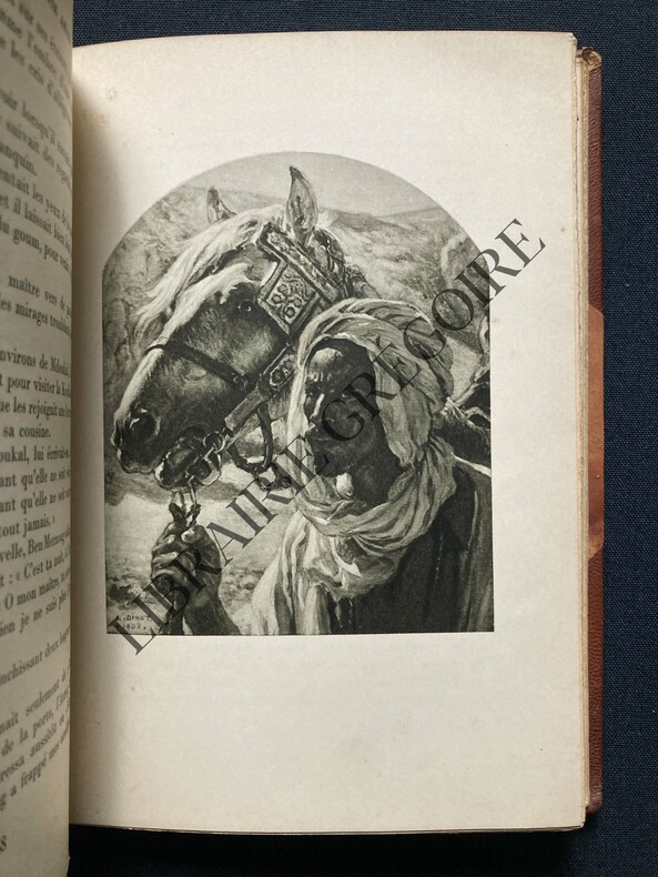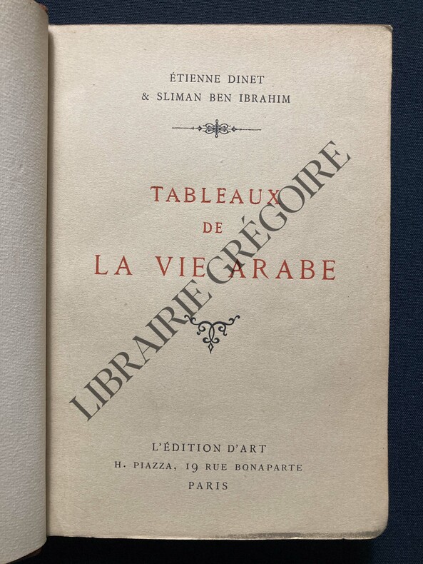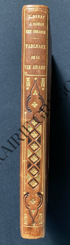 Paris, , Piazza, , Paris, , Piazza, (vers 1908) ; petit in-4° , cuir fauve, dos orné, tête dor., non rogné, couv. (Reliure de l’époque.) 4 ff., 193 pp., 2ff. "Portrait de Dinet et 25 planches hors-texte en noir de tableaux d’Etienne Dinet; l’une d’elles est un portrait de Sliman Ben Ibrahim. – Scènes de la vie arabe, légendes etc."