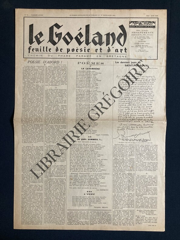 4 PAGES-38 CM X 55,5 CM-POEMES: LA LAVANDIERE, PAR ANGELE VANNIER, DE QUEL SOMMEIL?., PAR LUC BERIMONT, L'OGRE, PAR THEOPHILE BRIANT-LES DERNIERS JOURS DE SAINT-POL-ROUX, 2 PHOTOS (DIVINE SAINT-POL-ROUX ET SON GOELAND HEOL-SAINT POL ROUX)-LE MAGNIFIQUE, PAR GERMAINE BEAUMONT, SAINT POL ROUX-UN AMI DE VILLIERS DE L'ISLE ADAM, PAR RENE MARTINEAU, PHOTO LEMENANT DES CHESNAIE-LE CENTENAIRE DE LEON BLOY UNE LETTRE INEDITE DE L'AUTEUR DU "DESESPERE" A JOHANNES JORGENSEN, PAR THEOPHILE BRIANT, 3/4 PAGE, LITHOGRAPHIE DE GEORGES ROUAULT-HYMNE AU SAINT ESPRIT, PAR ALAIN MESSIAEN (ECRIT EN CAPTIVITE 1943)-LE DERNIER FRUIT DE L'ARBRE DE SCIENCE, PAR RAOUL AUCLAIR-(PJ1)