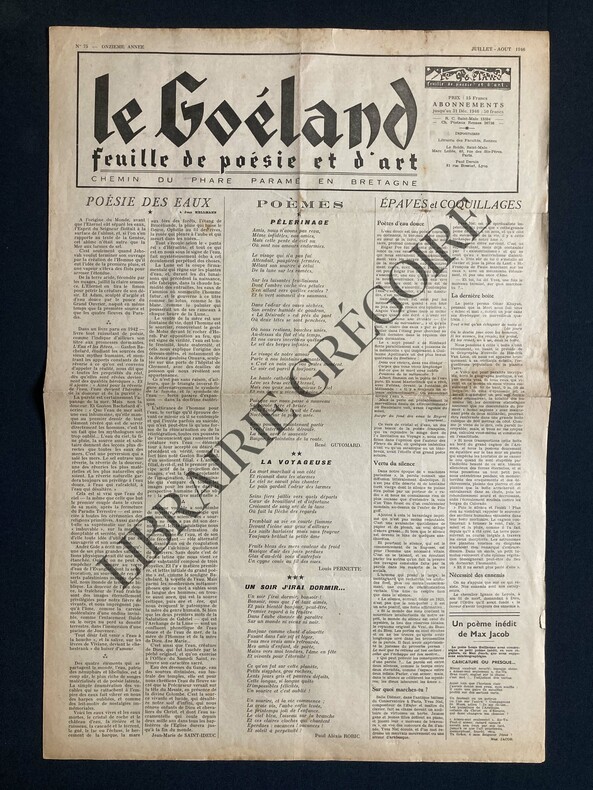 4 PAGES-40 CM X 60 CM-POESIE DES EAUX, PAR JEAN MARIE DE SAINT IDEUC-POEMES: PELERINAGE, PAR RENE GUYOMARD, LA VOYAGEUSE, PAR LOUIS PERNETTE, UN SOIR J'IRAI DORMIR., PAR PAUL ALEXIS ROBIC-UN POEME INEDIT DE MAX JACOB, CARICATURE OU PRESQUE.-LES ANGES ET LES POETES-ITINERAIRES DE MAX JACOB DES RIVES DE L'ODET AU CIMETIERE D'IVRY, 1 PAGE, 3 PHOTOS-LETTRE DE VACANCES, PHOTO GUILLAUME APOLLINAIRE-(PJ1)