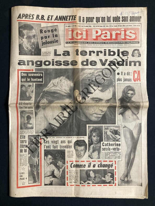 24 PAGES-43 CM X 60 CM-LA TERRIBLE ANGOISSE DE VADIM, 10 PHOTOS EN UNE (ROGER VADIM-BRIGITTE BARDOT-CATHERINE DENEUVE-ANNETTE VADIM), CES VINGT ANS QUI L'ONT FAIT TREMBLER, JOHNNY HALLYDAY, 2 PHOTOS-UN NOUVEAU CAUCHEMAR POUR LIZ TAYLOR-IRENE JAZY LE STADE ME PREND MON MARI, 3 PHOTOS-DESSIN DE DUBOUT EN P10-LES HOMMES QUE J'AI MARTYRISES, PAR MADELEINE SOLOGNE, 1 PAGE, 6 PHOTOS-L'ULTIMATUM DE JEAN-CLAUDE PASCAL C'EST MOI OU LE CINEMA, 3 PHOTOS-LA TROISIEME VICTIME DE COURT-PAYEN