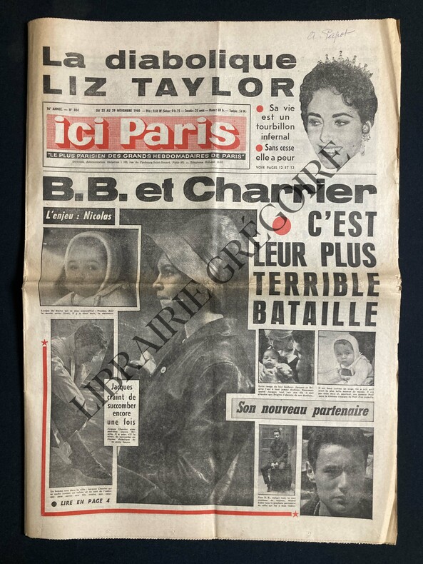 24 PAGES-43 CM X 60 CM-B.B. ET CHARRIER C'EST LEUR PLUS TERRIBLE BATAILLE, 5 PHOTOS-LA DIABOLIQUE LIZ TAYLOR, PHOTO-P4: TOUT S'ECROULE AUTOUR DE B.B. ET CHARRIER, 2 PHOTOS-LIZ TAYLOR L'UNIQUE, SUR 2 PAGES, 5 PHOTOS-SES JAMBES SONT PLUS CELEBRES QUE CELLES DE MARLENE DIETRICH, LA CHUNGA, PHOTO-ELLE AIME: LES HOMMES BIEN MANGER ET LA GLOIRE C'EST LE SAGITTAIRE JAYNE MANSFIELD, PHOTO-ROMY SCHNEIDER: "POURQUOI ME TUER? J'AIME ALAIN IL M'AIME ET LA VIE EST SI BELLE", 3 PHOTOS-4 DE COUVERTURE: CLARK GABLE: C'ETAIT LE PLUS GRAND, 11 PHOTOS, CAROLE LOMBARD, MARILYN MONROE