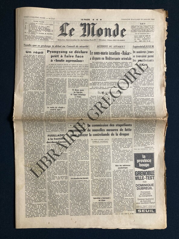18 PAGES-34 CM X 50 CM-ACCIDENT OU ATTAQUE? LE SOUS-MARIN ISRAELIEN "DAKAR" A DISPARU EN MEDITERRANEE ORIENTALE-LA CRISE ENTRE WASHINGTON ET PYONGYANG-LA NOUVELLE AFFAIRE DE COREE-LE CONFLIT VIETNAMIEN ET LA SITUATION EN ASIE-CINEMA: "L'ETRANGERE" DE SERGIO GOBBI-LA MODE: LES COLLECTIONS DE PRINTEMPS, DESSINS DE MARCQ (COURREGES-CARDIN)-LA SNCF MET EN SERVICE A LA GARE SAINT-LAZARE UN PREMIER DISTRIBUTEUR AUTOMATIQUES DE BILLETS-COMPLET