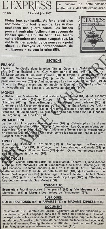 156 PAGES-IN 4-EN COUVERTURE: UN "CENTURION" ISRAELIEN EN PATROUILLE DANS LE DESERT DE NEGUEV-DE GAULLE DANS LA CRISE-PLEINS FEUX SUR ISRAEL-VIE MODERNE: LE BACHOT: UN SUPPLICE D'AVANT-GUERRE-LE ROBINSON DU XXe SIECLE, "VENDREDI OU LES LIMBES DU PACIFIQUE" PAR MICHEL TOURNIER-QUINZE PARTANTS APRES LES PRIX, 3 PHOTOS (BELLE DE JOUR-CASSIUS CLAY-JEAN PIERRE KALFON)-THEATRE: QUAND ACHARD AURAIT PU ETRE MARIVAUX, "JEAN DE LA LUNE"-CHANSONS: ADAMO, ENNEMI PUBLIC N°1, PHOTO-ART: LES DEFAUTS DE TIM, PHOTO-EXPOSITIONS: LE BEAU C'EST LE PROPRE, 1P PAR OTTO HAHN, 2 PHOTOS (TAKIS-HANS WALTER MULLER)-TOURNAGE: LAURENT TERZIEFF MIAULE A SAINT-CLOUD, PHOTO-JAZZ: LE FILLEUL INCONNU DE BOB HOPE, TONY BENNETT