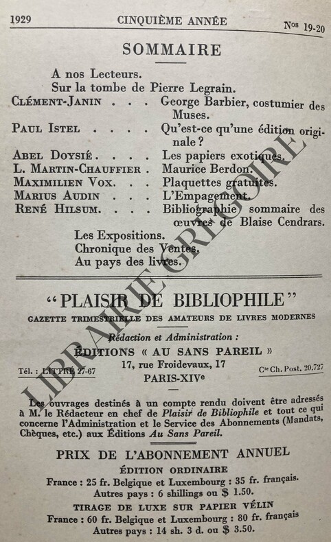 Collection "Plaisir de Bibliophile" numéro 19-20, sommaire (contents) : George Barbier costumier des muses, Qu'est-ce qu'une édition originale ?, Les papiers exotiques, Maurice Berdon, Plaquettes gratuites, L'Empagement, Bibliographie sommaire des oeuvres de Blaise Cendrars, Etc. - bon état (very good condition)