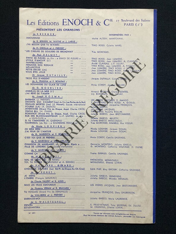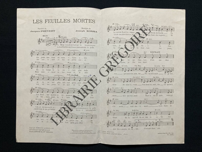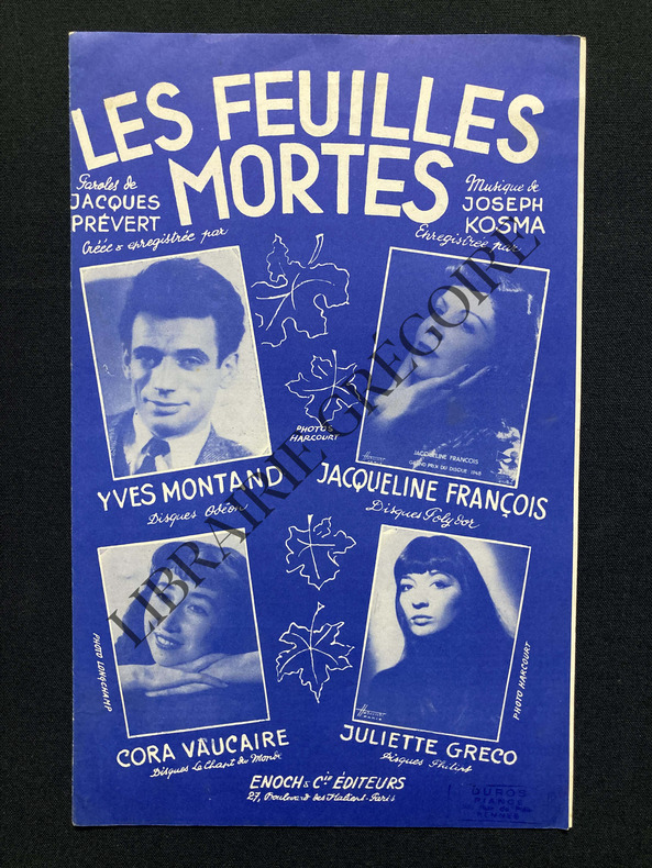 4 PAGES-17,5 CM X 27 CM-EN COUVERTURE PHOTOGRAPHIES DE YVES MONTAND ET TINO ROSSI (HARCOURT)-PORTEES ET PAROLES SUR 2 PAGES-PARPMES DE JACQUES PREVERT-MUSIQUE DE JOSEPH KOSMA-EN PAGE 4: OEUVRES DE JACQUES PREVERT ET JOSEPH KOSMA