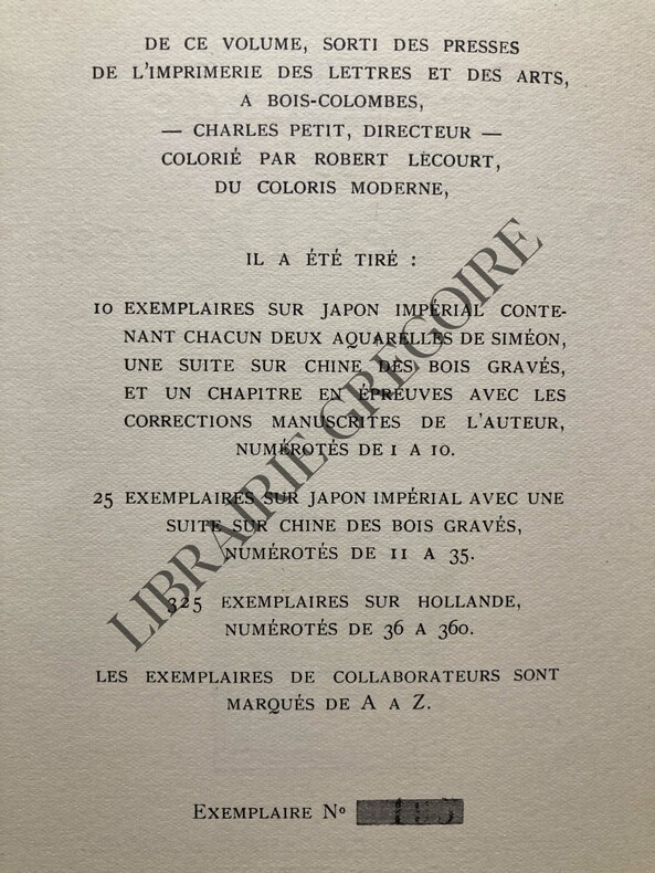 Paris Editions de la lampe d'argile. 1928 119p 1 volume IN8 broché. Couverture rempliée.Ouvrage orné de 23 bois aquarellés de Siméon.. Exemplaire numéroté sur Hollande.(Manques au dos). Siméon