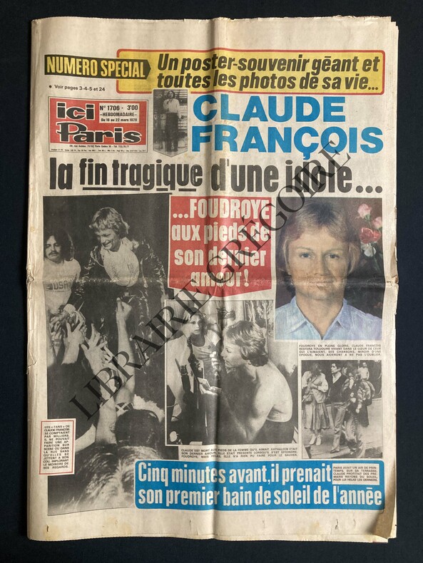 24 PAGES-43 CM X 60 CM-MORT DE CLAUDE FRANCOIS-EN SORTANT DE L'HOPITAL MARGARET SANGLOTAIT-UNE GRANDE ENQUETE SUR LES SECTES "BIDON"-DENISE FABRE:"JE ME MARIE LE 14 AVRIL".-DALIDA OBLIGEE DE VENDRE LA MAISON DU BONHEUR!-CHAUFFEUR DE MIREILLE MATHIEU AVANT DE DEVENIR L'IDOLE DES ROUTIERS, MAX MEYNIER-PHOTO PLEINE PAGE EQUIPE DE FOOTBALL DE BASTIA-EN DERNIERE PAGE: PHOTO COULEURS PLEINE PAGE DE CLAUDE FRANCOIS