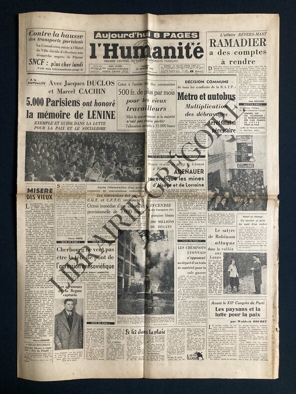 8 PAGES-43 CM X 60 CM-A LA MUTUALITE AVEC JACQUES DUCLOS ET MARCEL CACHIN 5.000 PARISIENS ONT HONORE LA MEMOIRE DE LENINE, PHOTO-PREMIER RESULTAT DU VOYAGE DE SCHUMAN A BONN ADENAUER REVENDIQUE LES MINES D'ALSACE ET DE LORRAINE-LES AGRESSEURS DE LA BEGUM CAPTURES-P3: LE DISCOURS DE JACQUES DUCLOS A LA MUTUALITE-P4: LOUIS FERDINAND CELINE ETAIT AGENT DE LA GESTAPO-LE TOUR 1950 SE TERMINERA UN LUNDI., CARTE