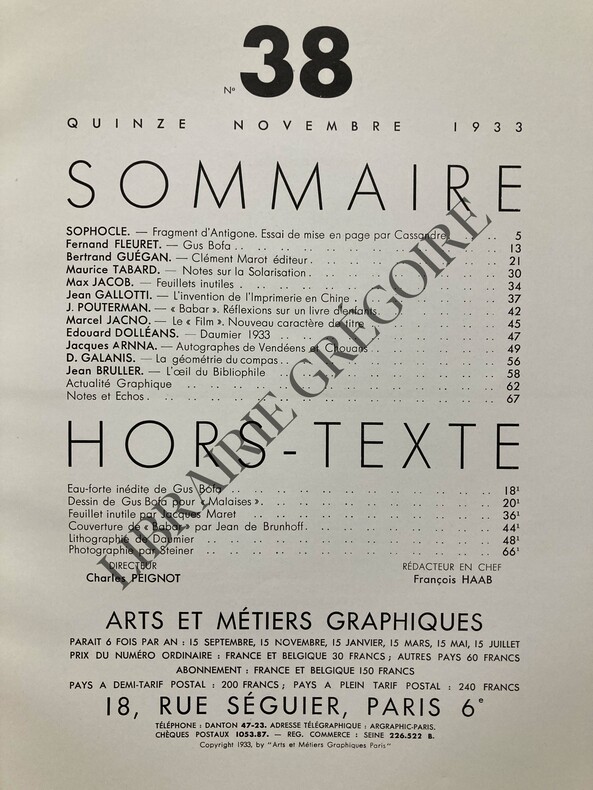 SOPHOCLE, FRAGMENT D'ANTIGONE ESSAI DE MISE EN PAGE PAR CASSANDRE-FERNAND FLEURET: GUS BOFA, 10 PAGES-BERTRAND GUEGAN: CLEMENT MAROT EDITEUR-MAURICE TABARD: NOTES SUR LA SOLARISATION-MAX JACOB: FEUILLETS INUTILES-JEAN GALLOTTI: L'INVENTION DE L'IMPRIMERIE EN CHINE-J.POUTERMAN: "BABAR" REFLEXIONS SUR UN LIVRE D'ENFANTS-MARCEL JACNO: LE "FILM" NOUVEAU CARACTERE DE TITRE-EDOUARD DOLLEANS: DAUMIER 1933-JACQUES ARNNA: AUTOGRAPHES DE VENDEENS ET CHOUANS-D.GALANIS: LA GEOMETRIE DU COMPAS-JEAN BRULLER: L'OEIL DU BIBLIOPHILE-HORS TEXTE: EAU FORTE INEDITE DE GUS BOFA, DESSIN DE GUS BOFA POUR "MALAISES", FEUILLET INUTILE PAR JACQUES MARET, COUVERTURE DE "BABAR" PAR JEAN DE BRUNHOFF, LITHOGRAPHIE DE DAUMIER, PHOTOGRAPHIE PAR STEINER-(400D)