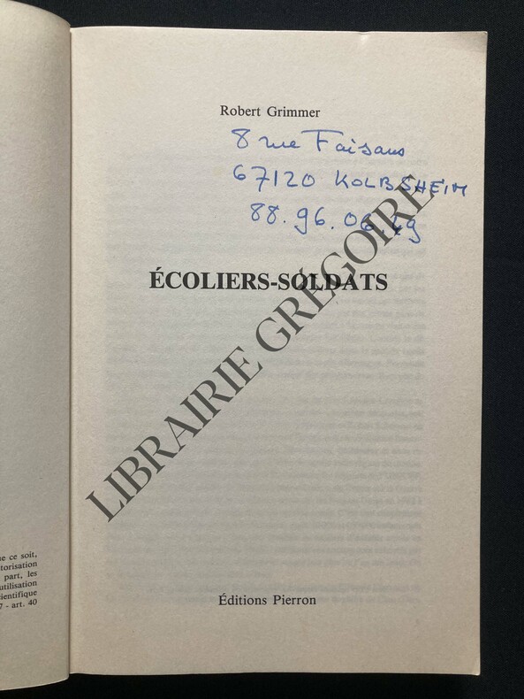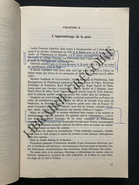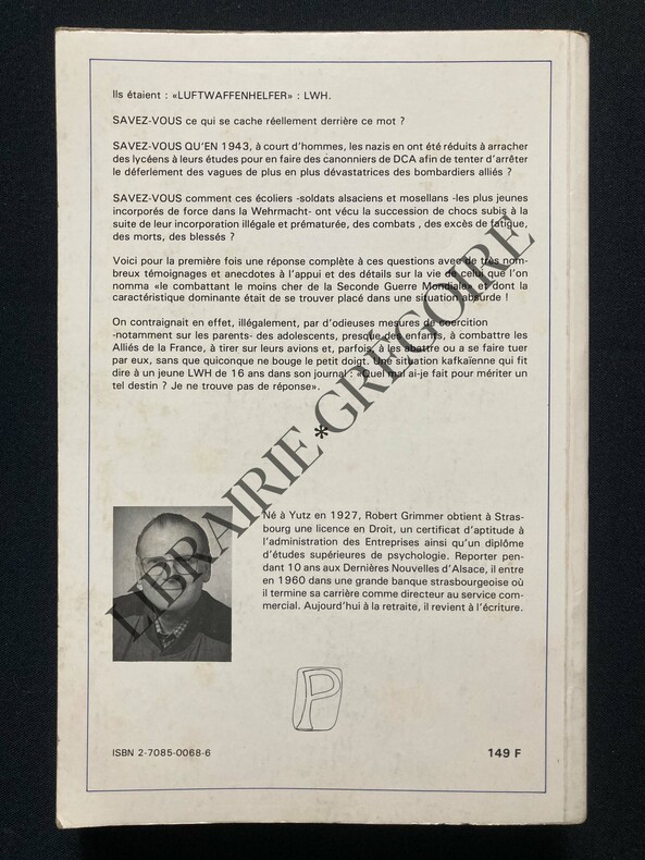 Sarreguemines, Editions Pierron, 1989 ; in-8, 279 pp., broché, couverture imprimée. Lycéens alsaciens et mosellans contre forteresses volantes…Collection "Documents Lorrains". Préface de Robert Muller. Oeuvre illustrée de photographies et de documents en noir et blanc, contient un annexe de documents.
