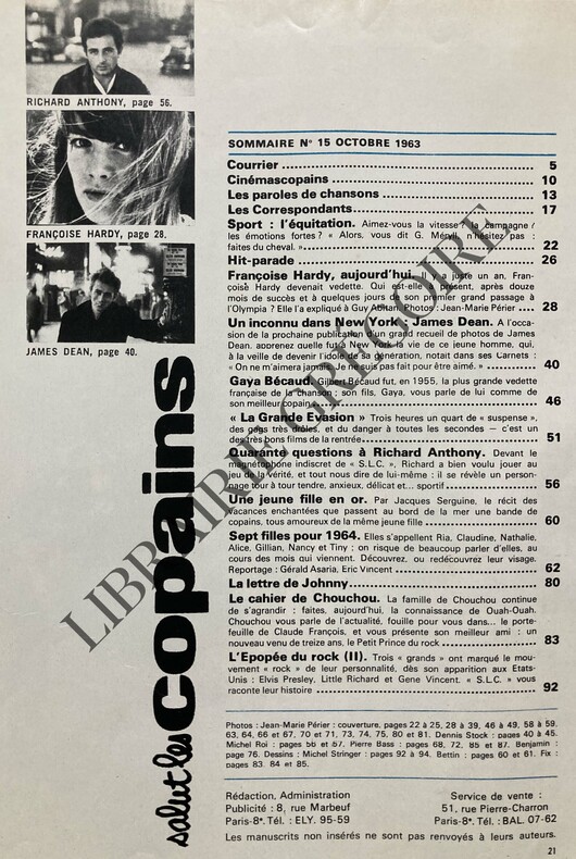 LE PLUS NOBLE COMMUN DE L'HOMME: LE CHEVAL, VIC LAURENS-FRANCOISE.UN AN APRES, PHOTOS JEAN MARIE PERIER-JAMES DEAN AVANT LA GLOIRE-GAYA BECAUD: LE PLUS CROULANT DES DEUX, C'EST MOI-LA GRANDE EVASION40 QUESTIONS A RICHARD ANTHONY-FILLES, CELLES QUI SONT BIEN PARTIES-LA LETTRE DE JOHNNY-L'EPOPEE DU ROCK 2 TROIS GRANDS DE LA PREMIERE HEURE: ELVIS, BILL, GENE-DOS RECOLLE AVEC TRACES ANCIENNES DE RUBAN ADHESIF-(BC24)