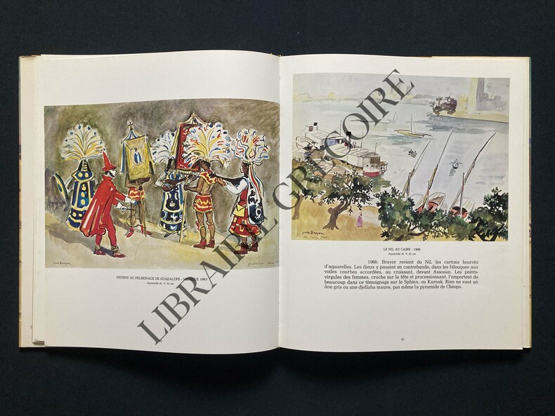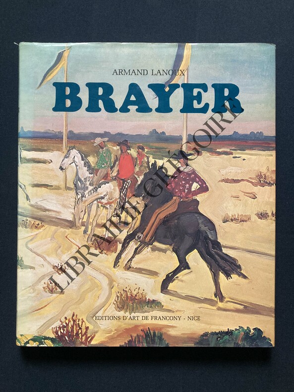 1975 Nice, Editions d'Art de Francony, 1975 ; in-4°, pleine toile ocre de l'éditeur illustrée en noir, jaquette illustrée sur les 2 plats d'un dessin de Brayer en couleurs, titre en bleu-vert, garde de papier bleu-vert illustrées de dessins en blanc; 145pp. Portrait photographique de l'artiste et très nombreuses reproductions en couleurs et en noir des oeuvres de Brayer.