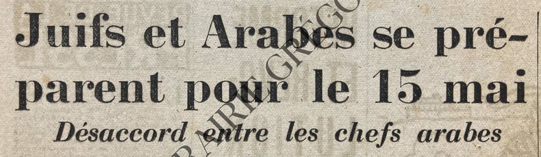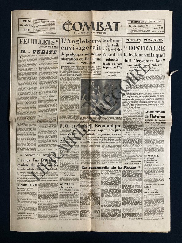 6 PAGES-38 CM X 52 CM-FEUILLETS, PAR ANDRE GIDE II VERITE-L'ANGLETERRE ENVISAGERAIT DE PROLONGER SON ADMINISTRATION EN PALESTINE TREVE A JERUSALEM-"PLUME AU VENT" A LA COMEDIE DES CHAMPS ELYSEES-JUIFS ET ARABES SE PREPARENT POUR LE 15 MAI DESACCORD ENTRE LES CHEFS ARABES-LE JAZZ, PAR BORIS VIAN LES FRANCAIS A MARIGNY-HUBERT DE LA MOTTE ROUGE EST RETROUVE-ROMANS POLICIERS "DISTRAIRE LE LECTEUR VOILA QUEL DOIT ETRE NOTRE BUT" NOUS DIT ALBERT PIGASSE