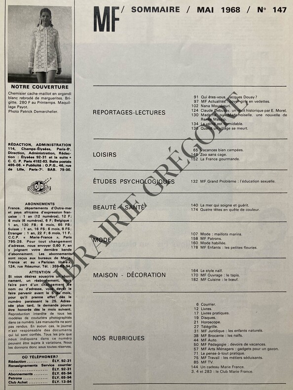 Marie France. 1968. In-4. Broché. Etat d'usage, Couv. légèrement passée, Agrafes rouillées, Intérieur acceptable. 286 pages agrafées - rousseurs sur les plats - nombreuses illustrations en couleurs et en noir et blanc dans et hors texte.. . . . Classification Dewey : 70.49-Presse illustrée, magazines, revues
