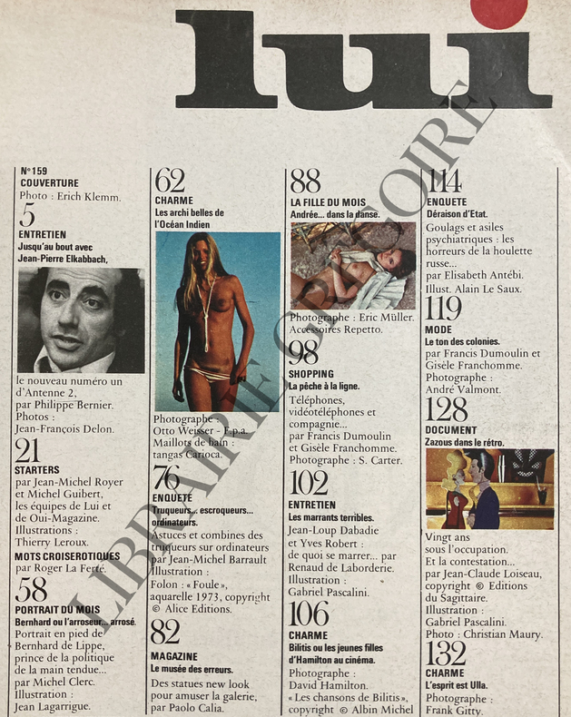 186 PAGES-IN 4-JUSQU'AU BOUT AVEC J.P. ELKABBACH-DANI POUR PUBLICITE RIVESALTES-BERNHARD OU L'ARROSEUR., BERNHARD DE LIPPE PRINCE DES PAYS-BAS-TRUQUEURS.ESCROQUEURS.ORDINATEURS ENQUETE SUR LES METHODES ET LES COMBINES DES ESCROCS L L'ORDINATEUR-LE MUSEE DES ERREURS, PAOLO CALIA-DESSIN PAR ASLAN-LA PECHE A LA LIGNE, TELEPHONE-LES MARRANTS TERRIBLES LES RECETTES DES PRINCE-EN-RIRE DU CINEMA FRANCAIS, YVES ROBERT, JEAN-LOUP DABADIE-BILITIS OU LES JEUNES FILLES D'HAMILTON AU CINEMA, 6 PAGES-DERAISON D'ETAT GOULAGS, CAMPS, HOPITAUX PSYCHIATRIQUES: LES HORREURS DE LA HOULETTE RUSSE-LE TON DES COLONIES, MODE-ZAZOUS DANS LE RETRO VINGT ANS SOUS L'OCCUPATION ET NON A L'EAU, DESESPEREMENT PLATE, DE VICHY-UN "R" DE GRAND SUD, RENAULT 17-CA MARCHE POUR EUX!: PHILIPPE BRUNON, CLAUDE SORDET, ROBERT BONNELL, ALAIN BOUCHERON, CERRONE, CHRISTIAN PAILLOT, 2P, 6 PHOTOS-(E623)