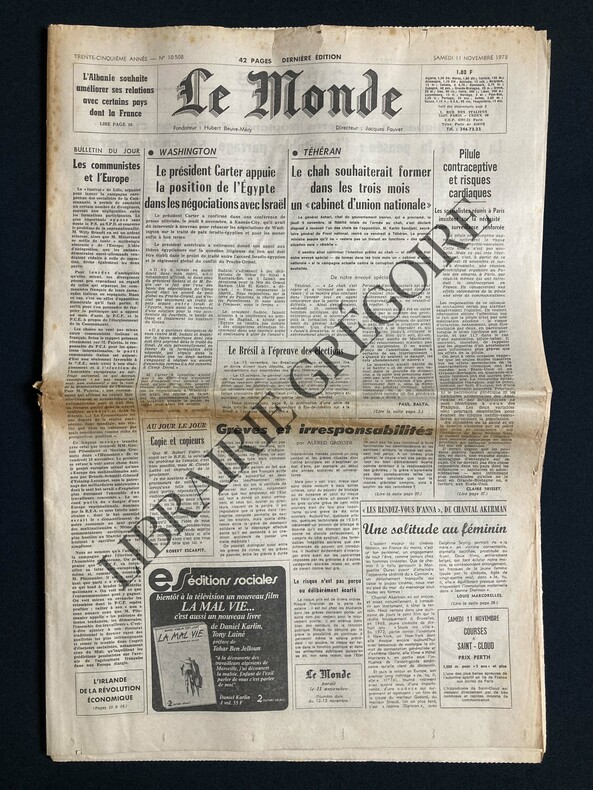 42 PAGES-35 CM X 50 CM-TEHERAN LE CHAH SOUHAITERAIT FORMER DANS LES TROIS MOIS UN "CABINET D'UNION NATIONALE"-PILULE CONTRACEPTIVE ET RISQUES CARDIAQUES-GREVES ET IRRESPONSABILITES, OAR ALFRED GROSSER-WASHINGTON LE PRESIDENT CARTER APPUIE LA POSITION DE L'EGYPTE DANS LES NEGOCIATIONS AVEC ISRAEL-"LES RENDEZ-VOUS D'ANNA", DE CHANTAL AKERMAN UNE SOLITUDE AU FEMININ-LE "MERCI" DE MAURICE CLAVEL-LA CRISE IRANIENNE LE GENERAL AZHARI PROCLAME LE LOYALISME DE L'ARMEE, DESSIN DE CHENEZ-L'IRLANDE DE LA REVOLUTION ECONOMIQUE, 4 PAGES-CYCLISME THEVENET VICTIME DE LA CORTISONE-ANDRE MALRAUX ET LE JAPON, EXPOSITION-LE GRAND PRIX DU ROMAN DE L'ACADEMIE FRANCAISE A PASCAL JARDIN ET A ALAIN BOSQUET-LA MORT DE NORMAN ROCKWELL L'ILLUSTRATEUR DU REVE AMERICAIN