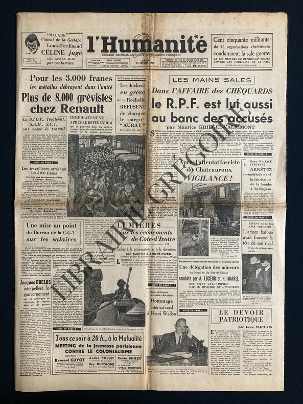 6 PAGES-43 CM X 60 CM-EN UNE: "MALADE" L'AGENT DE LA GESTAPO LOUIS-FERDINAND CELINE JUGE CET APRES-MIDI PAR CONTUMACE, DESSIN DE DONGA, SUITE P6-PLUS DE 8.000 GREVISTES CHEZ RENAULT, PHOTO-LES MAINS SALES DANS L'AFFAIRE DES CHEQUARDS LE R.P.F. EST LUI AUSSI AU BANC DES ACCUSES-P4: QU'EST-CE QUE LE COLONIALISME?, PAR ROGER GARAUDY-P5: DU SUD ALGERIEN QUE CHANTERENT LES POETES LE COLONIALISME A FAIT UN CHAMP DE MORT LENTE, 2 PHOTOS-DANS LES BIBERONS DES BEBES HONGROIS ON NE VERSE PLUS DE PAVOT SOPORIFIQUE, 2 PHOTOS