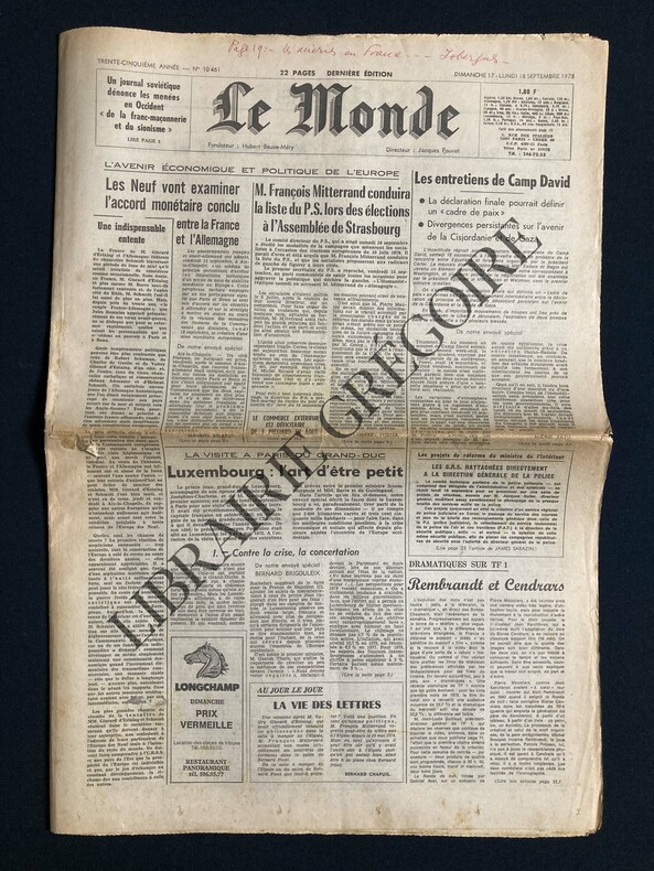 22 PAGES-35 CM X 50 CM-L'AVENIR ECONOMIQUE ET POLITIQUE DE L'EUROPE-LES ENTRETIENS DE CAMP DAVID-LA VISITE A PARIS DU GRAND DUC LUXEMBOURG: L'ART D'ETRE PETIT-IRAN: POUR LA REPUBLIQUE DE PERSE, PAR REZVANI, "NI MAHOMET NI MARX", PAR FERIDOUNE SAHEBJAM, LA REVANCHE DES TARBOUCHES, PAR PIERRE PLANCHER-HISTOIRE D'UN TABLEAU LA MALEDICTION DU PEINTRE, REMBRANDT, LA RONDE DE NUIT, ILL-LIVRE D'UNE GUERRE LE CAPORAL POETE, BLAISE CENDRARS, PATRICK PREJEAN-RADIO TELEVISION: LA GUERRE DES ONDES EN ANDORRE-AERONAUTIQUE: MORT DE WILLY MESSERSCHMITT-BOXE: MOHAMED ALI REPREND SON TITRE-CINEMA: "L'ANGOISSE DU GARDIEN DE BUT AU MOMENT DU PENALTY" DE WIM WENDERS
