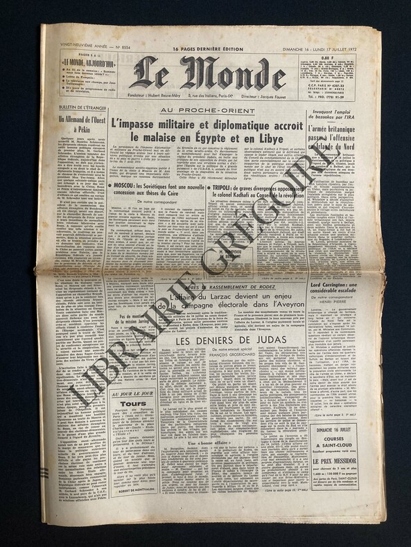 16 PAGES-34 CM X 50 CM-L'ARMEE BRITANNIQUE PASSE A L'OFFENSIVE EN IRLANDE DU NORD-L'AFFAIRE DU LARZAC DEVIENT UN ENJEU DE LA CAMPAGNE ELECTORALE DANS L'AVEYRON-GEORGES MATHIEU: SE METTRE A L'ECOUTE DES ARTISTES, TIERS DE PAGE, ILL-MARSHALL MCLUHAN: LES JEUNES AMERICAINS VEULENT ETRE PAUVRES-SCIENCE POLITIQUE, PAR ALAIN DUHAMEL: LE POUVOIR, DEMI-PAGE-L'AFFAIRE DU LARZAC LES DENIERS DE JUDAS-COMPLET