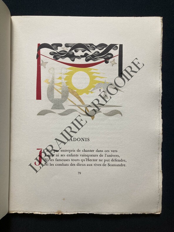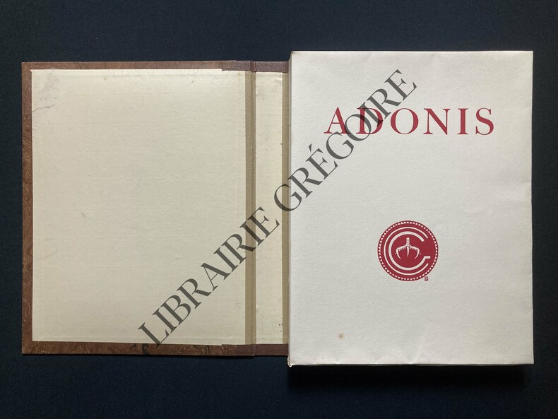 Ouvrage contant les amours d’Adonis et de Vénus. Fréron et Colbert s’inspirent du poète italien de la fin du XVIe siècle, Giambattista Marino.Édition illustrée de gravures de Nicolas Ponce d’après Charles Eisen : frontispice, titre gravé, grande vignette et cul-de-lampe.Plaisante reliure signée d’un bon relieur parisien.
