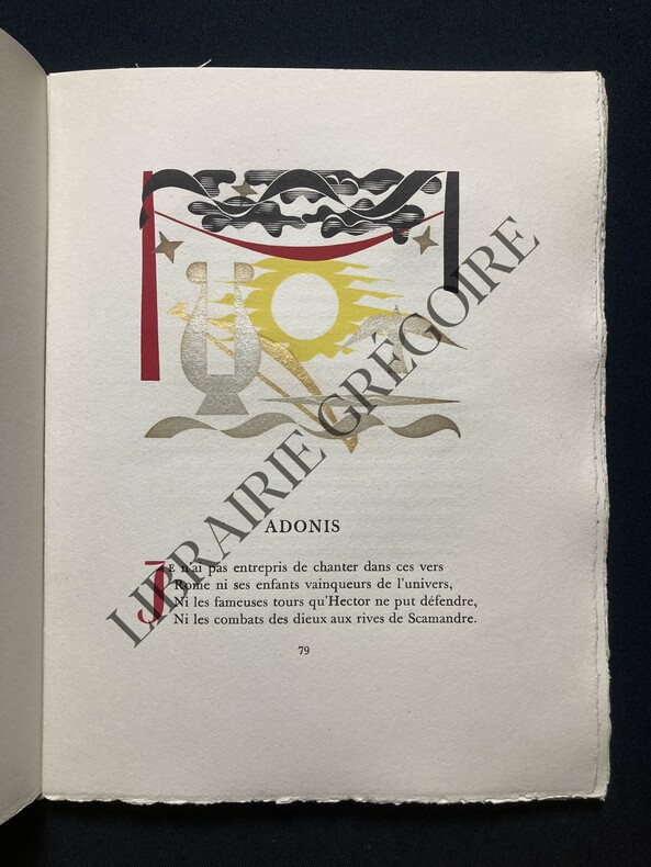 Ouvrage contant les amours d’Adonis et de Vénus. Fréron et Colbert s’inspirent du poète italien de la fin du XVIe siècle, Giambattista Marino.Édition illustrée de gravures de Nicolas Ponce d’après Charles Eisen : frontispice, titre gravé, grande vignette et cul-de-lampe.Plaisante reliure signée d’un bon relieur parisien.