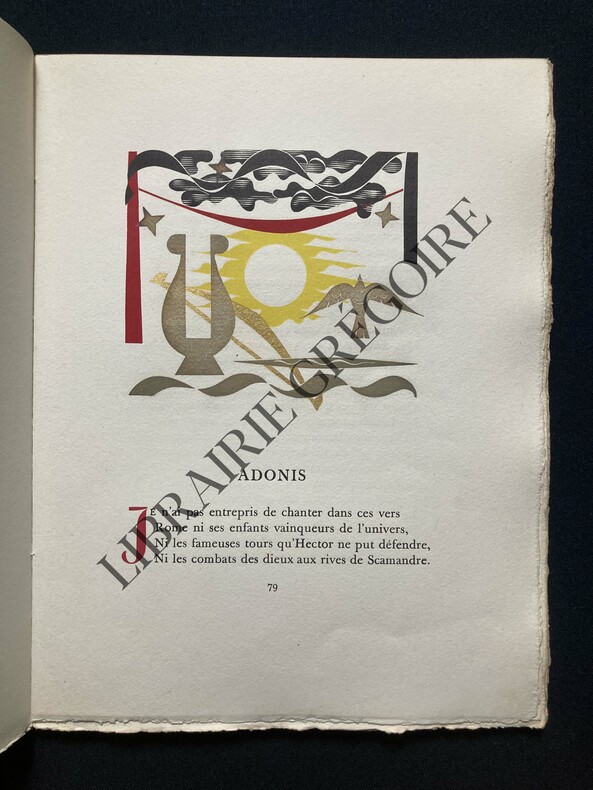 Ouvrage contant les amours d’Adonis et de Vénus. Fréron et Colbert s’inspirent du poète italien de la fin du XVIe siècle, Giambattista Marino.Édition illustrée de gravures de Nicolas Ponce d’après Charles Eisen : frontispice, titre gravé, grande vignette et cul-de-lampe.Plaisante reliure signée d’un bon relieur parisien.