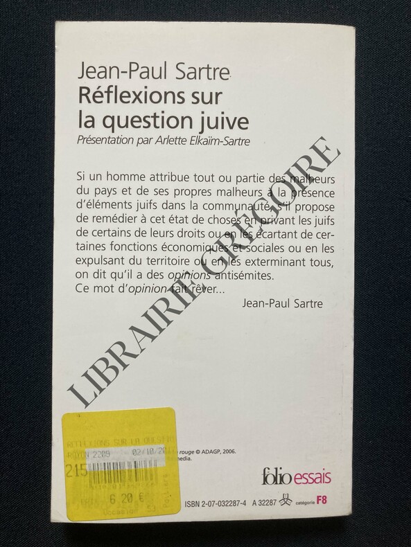 Gallimard Dos carré collé "Trois volumes in-12 (11 x 16,5 cm), dos carré collé, lot de 3 ouvrages de Jean-Paul Sartre dans la collection ""Idées"" de Gallimard : ""Baudelaire"" (1967, 245 pp.), ""Réflexions sur la question juive"" (1964, 185 pp.) et ""Qu'est-ce que la littérature ?"" (1967, 374 pp.) ; coiffes et bords des plats un peu frottés, pliure au dos du volume ""Baudelaire"", intérieur bruni, par ailleurs assez bon état général. Livraison a domicile (La Poste) ou en Mondial Relay sur simple demande."