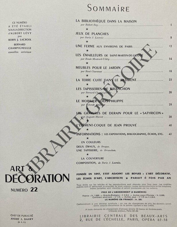 LA BIBLIOTHEQUE ET L'AMOUR DES LIVRES DANS LA MAISON, PAR ROBERT REY-JEUX DE PLANCHES, PAR BORIS J.LACROIX-UNE FERME AUX ENVIRONS DE PARIS-UN ATELIER D'EMAILLEURS A L'ABBAYE SAINT-MARTIN DE LIGUGE, PAR RENEE MOUTARD-ULDRY, 3 ILL (GEORGES BRAQUE)-MEUBLES POUR LE JARDIN-LA TERRE CUITE DANS LE BATIMENT-LES TAPISSERIES DE BRIANCHON-DU STYLE EMPIRE A LA DECADENCE LE MOBILIER LOUIS-PHILIPPE-LES GRAVURES D'ANDRE DERAIN POUR LE "SATYRICON", 2P, 3 ILL-L'ELEMENT COQUE DE JEAN PROUVE-(300H)