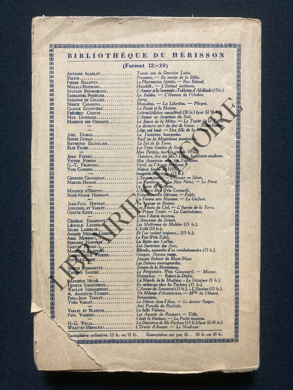 BIBLIOTHEQUE DU HERISSON-200 PAGES-12 CM X 19 CM-EN GRANDE PARTIE NON COUPE-MANQUE COIN INF GAUCHE DEUXIEME PLAT-(17C)