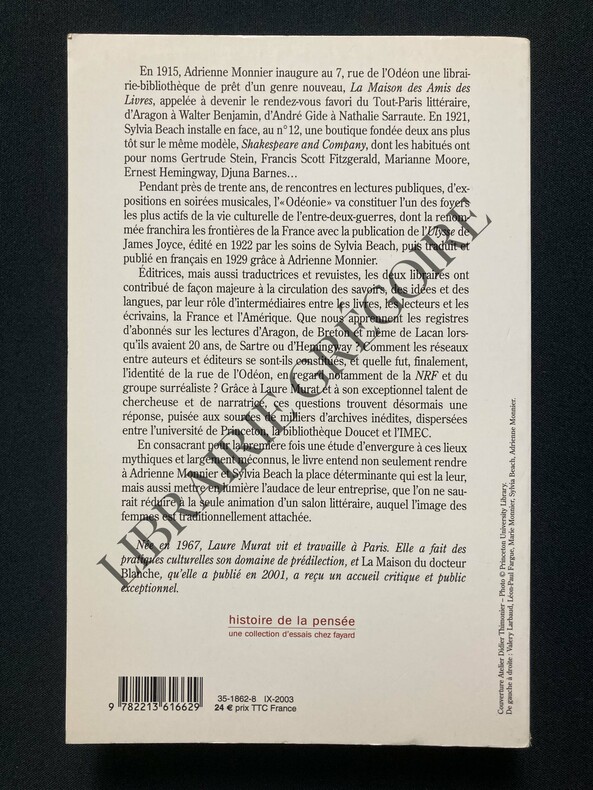 Fayard "Histoire de la pensée" 2003, in-8 broché, 369 p. (petite pliure angulaire au premier plat de couverture, plis de lecture au dos, sinon très bon exemplaire) Cahier photos, chronologie, bibliographie et index. Adrienne Monnier créa en 1915 une librairie-bibliothèque d'un genre nouveau, rue de l'Odéon, exemple imité par son amie, Sylvia Beach quelques années plus tard ; elles furent pendant trente ans un des hauts lieux de la vie littéraire parisienne, d'où l'importance de cette étude novatrice qui leur est consacrée.