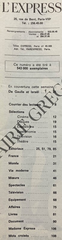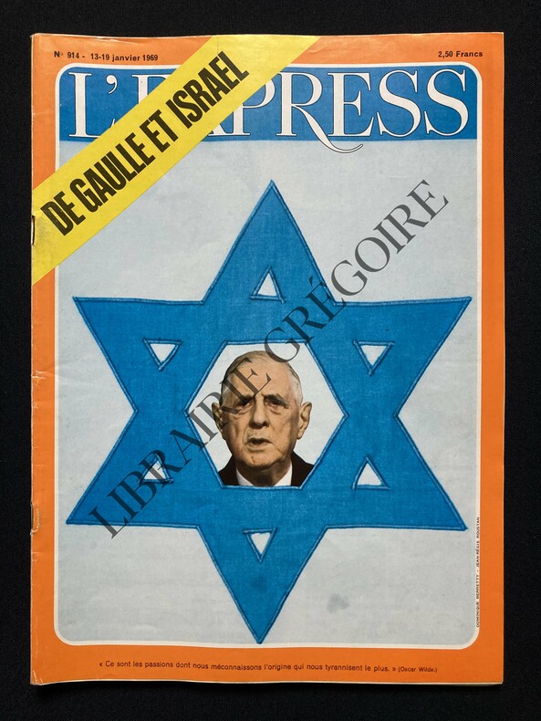 110 PAGES-IN 4-EN COUVERTURE CHARLES DE GAULLE-FRANCE: DE GAULLE ET ISRAEL, DESSIN DE TIM (CHRIST SUR CROIX DE LORRAINE)-ISRAEL ET NOUS, PAR JEAN-JACQUES SERVAN-SCHREIBER-MONDE: MOYEN-ORIENT: L'IDEE FOLLE-LE DERNIER DES KENNEDY RAMASSE LE BATON, EDWARD KENNEDY-MOEURS: LE ROMAN DES FAUSSAIRES, PAR ANDRE BERCOFF, 2 PAGES, 4 PHOTOS-L'EXPRESS INTERROGE LA NOUVELLE VAGUE-SPECTACLES: LELOUCH, LA VIE, LA MORT, 2 PAGES, 3 PHOTOS-SUCCES: MOWGLI PLUS FORT QUE JAMES BOND-RENAUD VERLEY 10 SUR 10 POUR LE 5 A 7, PHOTO-LA RENARDE EN CAVALE, OLYMPIA, PHOTO-CHANSONS: LA SAISON EN ENFER DU DIVIN LEO, PHOTO LEO FERRE-ARLETTY NE VEUT PAS FAIRE CARRIERE, PHOTO-TV CRITIQUE: DRACULA N'ETAIT PAS AU RENDEZ-VOUS, PHOTO CHRISTOPHER LEE-EQUIPEMENT: M. LINDSAY PEUT-IL DOMPTER NEW-YORK ?, 2P, 2 PHOTOS-TRANSPORTS: LE "QUEEN ELIZABETH II" SOMBRE DANS LE COMIQUE, PHOTO-AFFAIRES: LES PATRONS VUS PAR EUX-MEMES-LITTERATURE: LE SCANDALE D'ETRE DANS UN CORPS, PAR MADELEINE CHAPSAL, "WATT" PAR SAMUEL BECKETT, PHOTO-DOCUMENT: DUBCEK L'ANTI HEROS, 7 PAGES-PUBLICITE RTL, GEORGES DE CAUNES