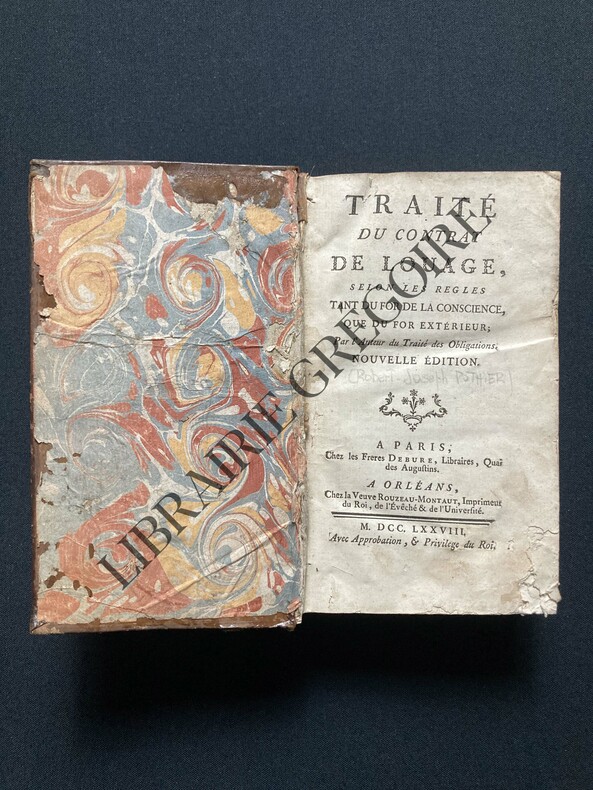 Texte majeur de l'auteur, où sont abordés le louage "des choses" et le louage d'ouvrage. Il est généralement suivi du traité du contrat de bail à rente, lequel concerne le principe des paiements échelonnés qui permettaient d'échapper à l'interdiction du prêt par intérêt. Pothier y donne des notions sur la théorie de l'usure. - Menus défauts à la reliure. Intérieur frais. L'imprimeur a placé en tête du second traité un charmant bandeau gravé sur bois représentant une scène d'exploration (navire faisant feu, volcan, indigènes). Les autres exemplaires comportent généralement un bandeau typographique.