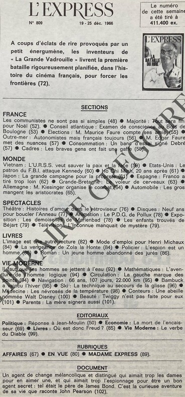EN COUVERTURE LOUIS DE FUNES DANS "LA GRANDE VADROUILLE"-EXPOSITIONS, PAR OTTO HAHN: PASCIN, JEAN-CLAUDE BELLIER-LES COMMUNISTES NE SONT PAS SI SIMPLES-REPONSE A JEAN-MOULIN-ELECTIONS: M.MAURICE FAURE COMPTE SES AMIS, PHOTO DANNAUD-L'URSS VEUT SAUVER LA PAIX ET LA FACE-SPECTACLES: LA BATAILLE DU RIRE, 4 PAGES-ANIMATION: SERGE DANOT, LE PDG DE POLLUX, PHOTO-EXPOSITIONS: LES DEMOISELLES DE MARIENBAD, PAUL DERVAUX, PHOTO (L'HOMME DE LA RUE)-LES ENFANTS TROUVES DE BEJART, PHOTO-CATHERINE BAVARDE, PHOTO CATHERINE DENEUVE ET DAVID BAILEY-LES 7 PECHES DE CLAUDIA, 2 PHOTOS CLAUDIA CARDINALE-LIVRES: L'IMAGE EST UNE AUTRE LECTURE-LITTERATURE: MODE D'EMPLOI POUR HENRI MICHAUX, PAR MADELEINE CHAPSAL, PHOTO-VIE MODERNE: IL FAUT QUE LES HOMMES SE JETTENT A L'EAU-BAMBUCK A VAINCU L'HIVER, PHOTO-CONTEURS: UNE ABEILLE NOMMEE WALT DISNEY, 2 PHOTOS, PRIX NOBEL-BEAUTE: TWIGGY N'EST PAS FAITE POUR EUX, 1P, 2 PHOTOS (TWIGGY-RAQUEL WELCH)-LA VIE DE IAN FLEMING L'INVENTEUR DE JAMES BOND, 9 PAGES