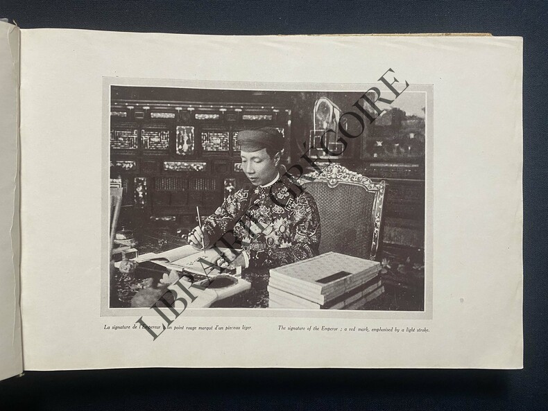 27,5 CM X 18,8 CM-OBLONG-ILLUSTRATION COULEURS PAR EUGENE BERINGUIER (LEGERS MANQUES EN MARGES)-TEXTE FRANCAIS ET ANGLAIS-CLICHES DE LA MISSION PHOTO-CINEMATOGRAPHIQUE DU GOUVERNEMENT GENERAL DE L'INDOCHINE-ALBERT SARRAUT-FAMILLE IMPERIALE-MINISTRES-PALAIS IMPERIAL-VIE LOCALE-ARCHITECTURE-G. DE MALHERBE IMPRIMEURS A PARIS-(DE825)