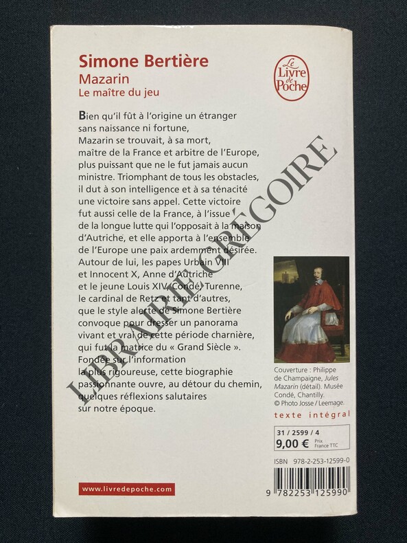 Bien qu'il fût à l'origine un étranger sans naissance ni fortune, Mazarin se trouvait, à sa mort, maître de la France et arbitre de l'Europe, plus puissant que ne le fut jamais aucun ministre. Triomphant de tous les obstacles, il dut à son intelligence et à sa ténacité une victoire sans appel. Cette victoire fut aussi celle de la France, à l'issue de la longue lutte qui l'opposait à la maison d'Autriche, et elle apporta à l'ensemble de l'Europe une paix ardemment désirée. Autour de lui, les papes Urbain VIII et Innocent X, Anne d'Autriche et le jeune Louis XIV, Condé, Turenne, le cardinal de Retz et tant d'autres, que le style alerte de Simone Bertière convoque pour dresser un panorama vivant et vrai de cette période charnière, qui fut la matrice du "Grand Siècle". Fondée sur l'information la plus rigoureuse, cette biographie passionnante ouvre, au détour du chemin, quelques réflexions salutaires sur notre époque.