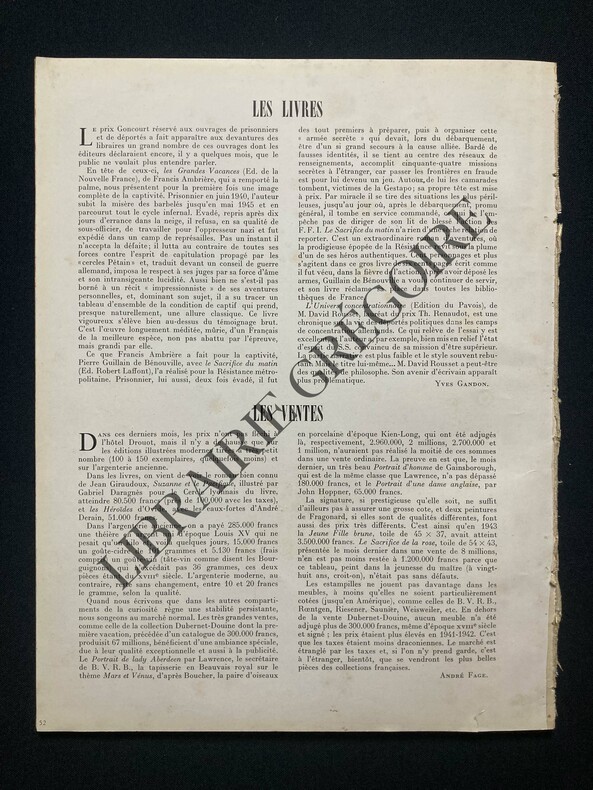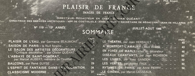 23,7 CM X 30,6 CM-PLAISIR DE L'EAU, PAR GERMAINE BEAUMONT, PHOTOS JAHAN, BRASSAI, WILLY RONIS,.-VACANCES, PAR J.A.BONNAUD, 2 PAGES, COSTUMES HERMES, VERA BOREA, DESSES-LA NUIT FORAINE DES CHAMPS ELYSEES, 2 PAGES, 6 PHOTOS-LE SALON DES ARTISTES DECORATEURS "CRITIQUE DECORATIVE", 5 PAGES, 11 PHOTOS (ARBUS-ADNET-POILLERAT-SOGNOT-SUBES-PAULE MARROT-GUIGUICHON)-L'ABBAYE DE SAINT-HONORAT, PAR MARCEL AUBERT, 5 PAGES-LA VIE DES MOINES, 7 PAGES, PHOTOS ANDRE STEINER-BALCONS, PAR RENE GUYSE, 5 PAGES-L'ESPRIT DE FANTAISIE DANS LA DECORATION, 2P, 4 PHOTOS-CLASSICISME MODERNE, 4 PAGES, 9 PHOTOS (POILLERAT-PAULE MARROT-ROYERE)-LE THEATRE, 3 PAGES, PRIMAVERA DE CLAUDE SPAAK, 4 PHOTOS (MAQUETTES VALENTINE HUGO), 4 DESSINS DE DERO-A MONTFORT L'AMAURY DEUX VOISINS, GERMAINE BEAUMONT, MARCEL HERRAND, 3 PAGES, 6 PHOTOS-EN FORET DE MARLY CHEZ UN DECORATEUR, 4 PAGES, 9 PHOTOS-LES COLLECTIONS: OISEAUX CHANTANTS, 2 PAGES-4 DE COUVERTURE ABSENTE