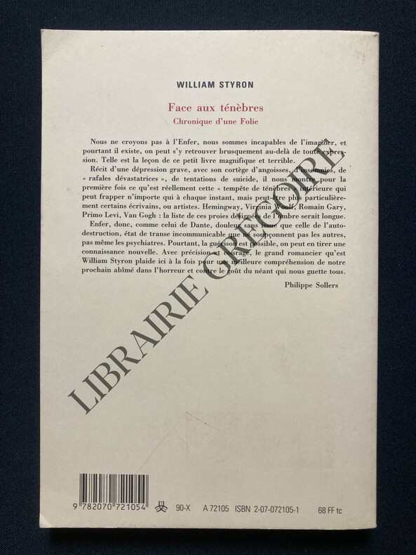 "Nous ne croyons pas à l'Enfer, nous sommes incapables de l'imaginer, et pourtant il existe, on peut s'y retrouver brusquement au-delà de toute expression. Telle est la leçon de ce petit livre magnifique et terrible. Récit d'une dépression grave, avec son cortège d'angoisses, d'insomnies, de "rafales dévastatrices", de tentations de suicide, il nous montre pour la première fois ce qu'est réellement cette "tempête des ténèbres" intérieure qui peut frapper n'importe qui à chaque instant, mais peut-être plus particulièrement certains écrivains, ou artistes. Hemingway, Virginia Woolf, Romain Gary, Primo Levi, Van Gogh : la liste de ces proies désignées de l'ombre serait longue. Enfer, donc, comme celui de Dante, douleur sans autre issue que celle de l'autodestruction, état de transe incommunicable que ne soupçonnent pas les autres, pas même les psychiatres. Pourtant, la guérison est possible, on peut en tirer une connaissance nouvelle. Avec précision et courage, le grand romancier qu'est William Styron plaide ici à la fois pour une meilleure compréhension de notre prochain abîmé dans l'horreur, et contre le goût du néant qui nous guette tous." Philippe Sollers.