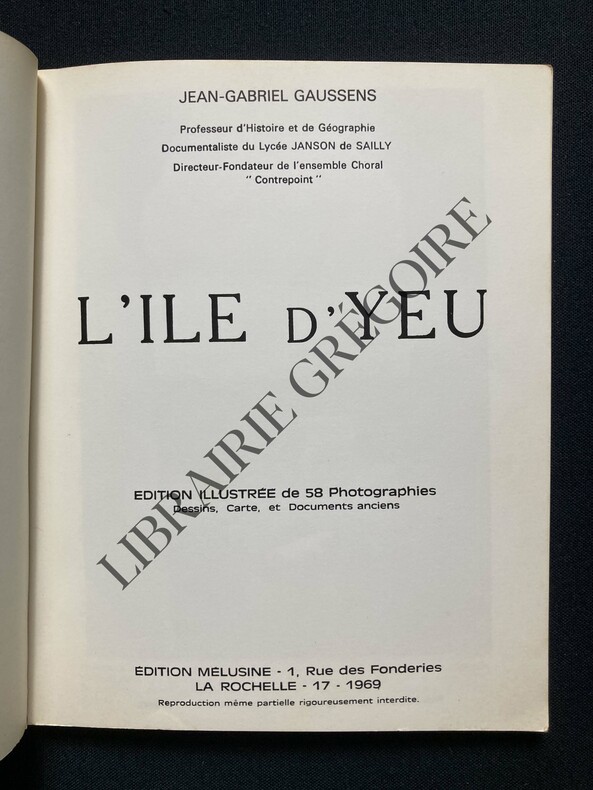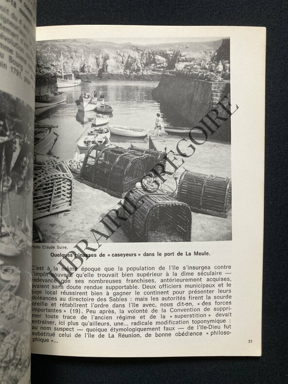 La Rochelle Editions Mélusine 1969 in-8 broché une plaquette, brochée in-octavo, couverture illustrée en couleur, carte de l'ile d'yeu sur double feuille dépliante, orné de 58 clichés et dessins et documents anciens in et hors-texte en noir, 82 pages, 1969 La Rochelle Editions Mélusine,