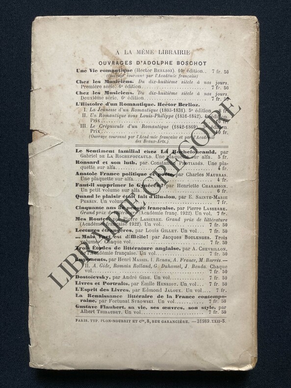 Paris, Librairie Plon, 1925, in-12 broché, 237 pp, envoi de l'auteur à Lucien Corpechot (?) en page de faux titre. Edition originale sur papier courant après 25 exemplaires sur vélin lafuma. Petits manques aux coiffes et dos un peu insolé, taches, sinon couverture en bon état, intérieur un peu défraîchi (marge) sinon en bon état.