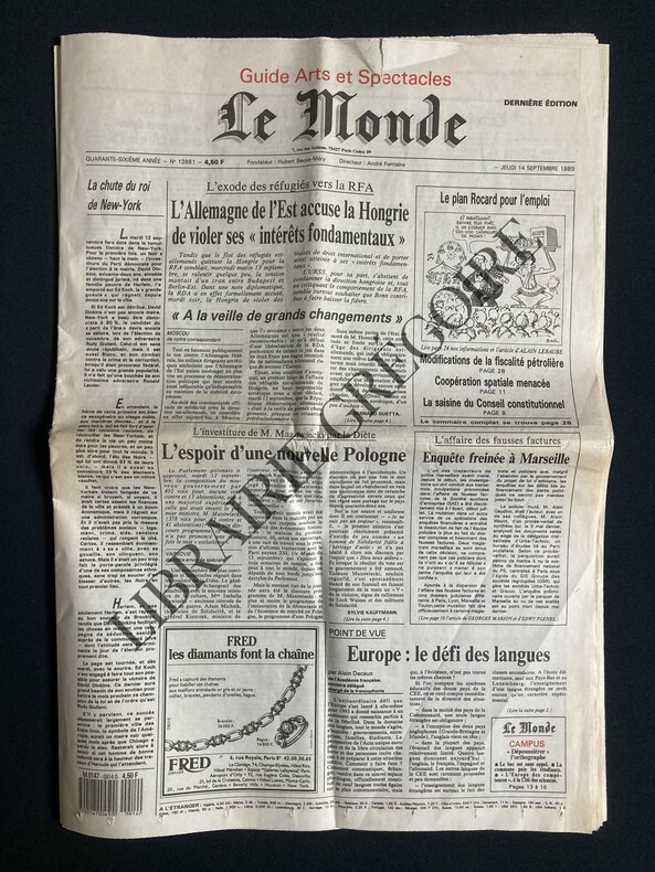 POINT DE VUE: EUROPE: LE DEFI DES LANGUES, PAR ALAIN DECAUX-L'AFFAIRE DES FAUSSES FACTURES ENQUETE FREINEE A MARSEILLE, 1 PAGE, DESSIN DE SERGUEI-"DEPOUSSIERER" L'ORTHOGRAPHE., 1P, DESSIN DE BARBE-UNIVERSITE: LA COMMUNE PAIE LES ETUDIANTS, CHENOVE-PARIS ILE DE FRANCE UN POINT DE VUE DE JEAN-PIERRE FOURCADE LES SIX POINTS-CLES DE LA REFORME REGIONALE-DANIELE GILBERT MAINTENUE EN DETENTION PAR LE JUGE D'INSTRUCTION-1929-1941:"NAISSANCE" DE BATMAN, SUPERMAN, DRACULA, FRANKENSTEIN. HEROS-REFLETS DE LA GRANDE PEUR, 3 PAGES, 13 PHOTOS-ROCK: EURYTHMICS, PHOTO-"BENVENUTO CELLINI" A LYON BERLIOZ PRIS AU MOT PAR LES ANGLAIS, ILL-RENCONTRE AVEC ROGER MIRMONT LE BLOUSON DORE DE LA COMEDIE-FRANCAISE, PHOTO-NOUVELLES EXPOSITIONS: PIERRE MOLINIER, PARIS, SOULAGES, NANTES