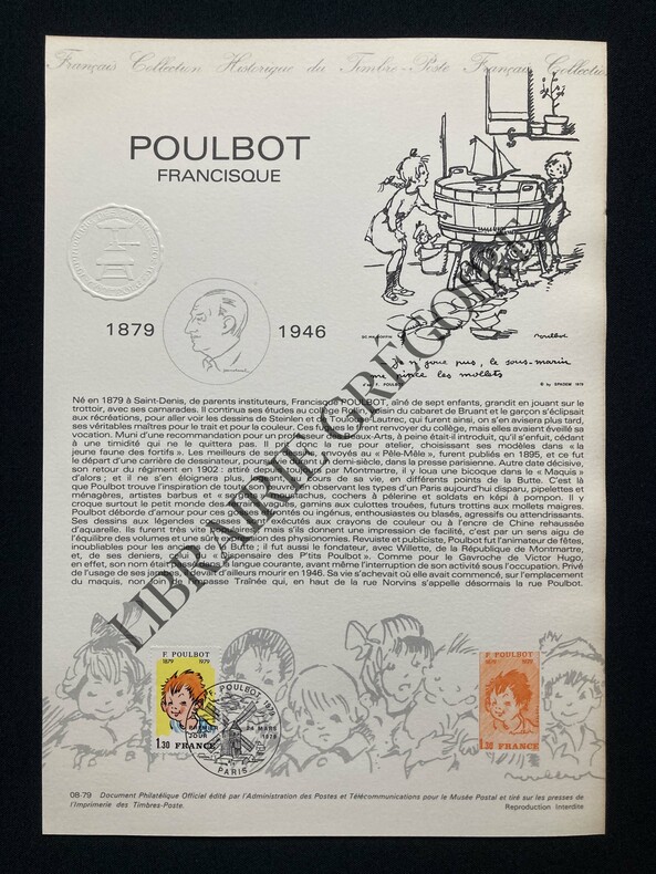 1 PAGE FORMAT A4-TIMBRE-CACHET PREMIER JOUR-2 DESSINS DE POULBOT-HISTORIQUE-(CPP1)