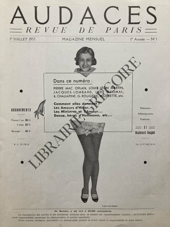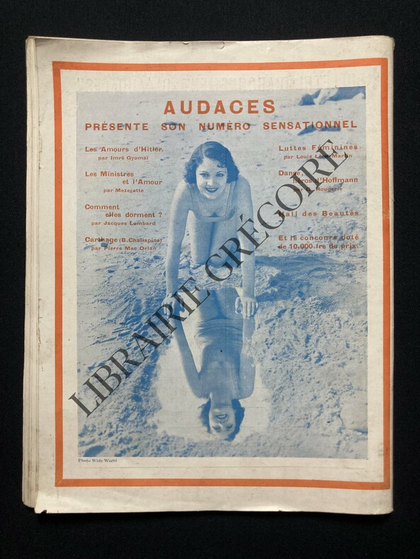 48 PAGES-AUDACES POURQUOI?-LES AMOURS D'HITLER, PAR IMRE GYOMAI, 4 PAGES, 5 PHOTOS (WINIFRED WAGNER-LENI RIFFENSTHAL)-COMMENT ELLES DORMENT, PAR JACQUES LOMBARD, 6 PAGES, 7 PHOTOS, MARY MARQUET, GABY MORLAY, FANNY HELDY, MARY BELL, RAMATAHE-CARTHAGE, PAR PIERRE MAC ORLAN, 3P, ILLUSTRATIONS DE B CHALIAPINE-LES MINISTRES ET L'AMOUR, PAR JEAN MEZERETTE, ILLUSTRATIONS VAN DEN KEMP-LES NUITS DE MACAO, PAR CHARLES MONBASE, 5 PAGES, 7 PHOTOS-DANSE, HEROS D'HOFFMANN, PAR G ROUGERIE, ARMAND MONTAIGLE CLAUDEL, 4 PAGES, 4 PHOTOS-LUTTES FEMININES, PAR LOUIS LEON-MARTIN, 2 PAGES, 2 PHOTOS-CINEMA: LIEBELEI, THE KID FROM SPAIN, 2P, 4 PHOTOS-