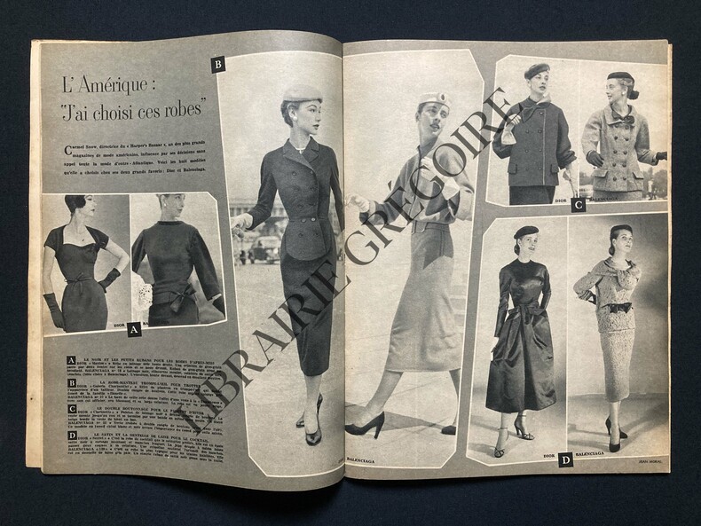 60 PAGES-23,5 CM X 31 CM-EN COUVERTURE: TAILLEUR DE KOLINSKY, TOQUE SCHIAPARELLI-QUE FAIT-ON A CANNES?, GRETA GARBO, PHOTO-QUE FAIT-ON A VENISE?-LE NOUVEAU DON D'ADELE OU LE MIRACLE DE LA MULTIPLICATION DES ROBES, PAR PHILIPPE HEDUY, CONTE FANTASTIQUE LA LA MANIERE DE MARCEL AYME, 4 PAGES, 10 PHOTOS, GABY SYLVIA-L'AMERIQUE: "J'AI CHOISI CES ROBES", 2 PAGES, 8 PHOTOS (DIOR-BALENCIAGA)-LES TROIS FILLES DE NICOLE DAGAND, 2 PAGES-CATHERINE-PARIS, PAR LA PRINCESSE BIBESCO-A NEUILLY CAPITALE DES VEDETTES ON RENTRE DE VACANCES POUR RETROUVER LA CAMPAGNE, 2 PAGES, 9 PHOTOS (FRANCOIS PERIER-JANY HOLT-JEAN MARAIS-GABY SYLVIA-ANDRE MAUROIS-.)-