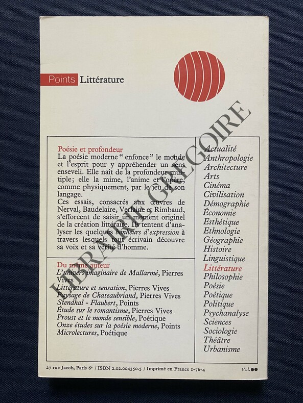 Paris, Seuil, 1955. In-8, br., 250p. Table : Géographie magique de Nerval - Profondeur de Baudelaire - Fadeur de Verlaine - Rimbaud ou la poésie du devenir.Quelques annotations au crayon de papier.