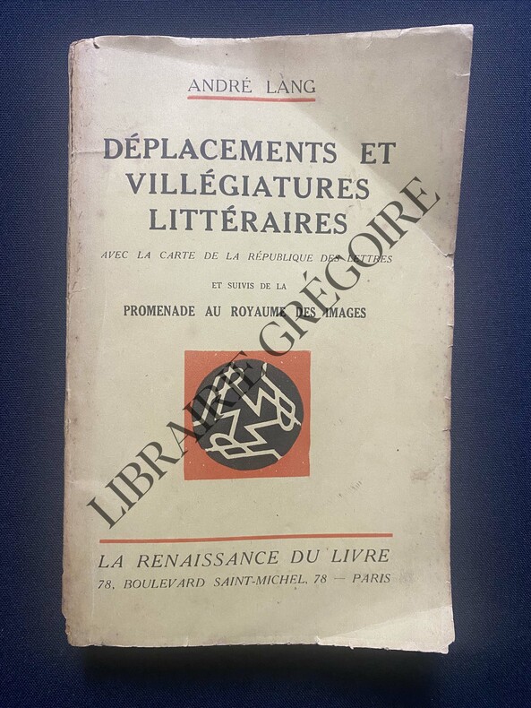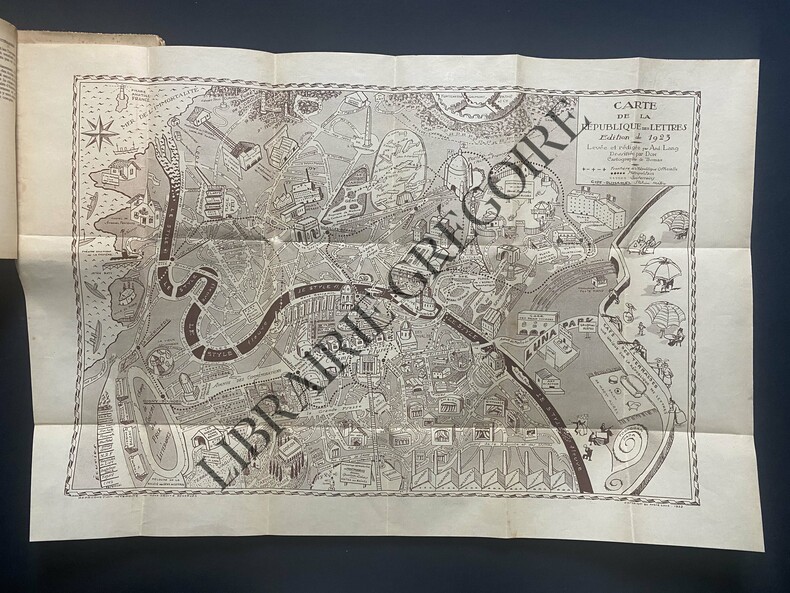 Recueil d'articles publiés par l'homme de lettres et journaliste André LANG (1893-1986) dans "Les Annales" sur les salons et milieux littéraires ("les Jeudis" de Mme Aurel, "les Mardis de Mme Rachilde", la "N.R.F.", le "Crapouillot" et ses dîners, les cafés littéraires, etc), et, parus dans la "Revue hebdomadaire", sur le cinéma (Marcel L'Herbier, Louis Delluc, entretien avec Abel Gance, etc); précédés d'une fantaisiste "Carte de la République des Lettres" levée et rédigée par l'auteur, et dessinée par DON (datée 1923), avec commentaire. Mention de 6è édition; exemplaire bien complet de sa grande carte dépliante.