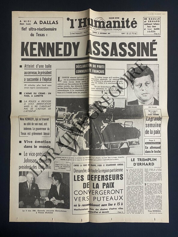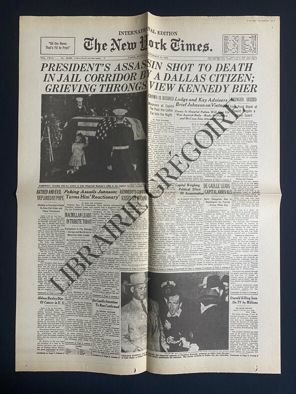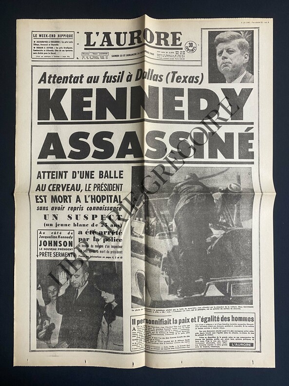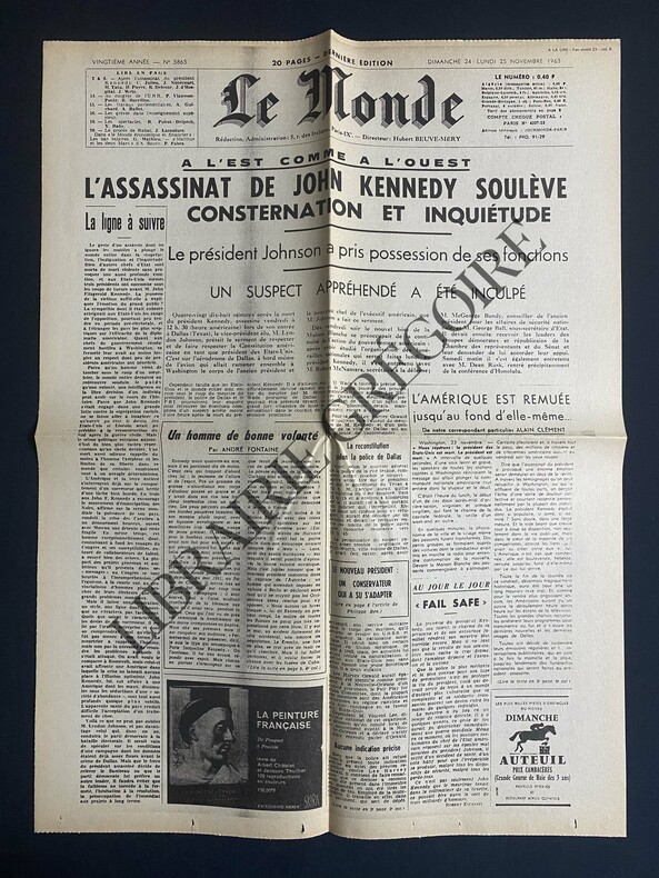 16 PAGES-FORMAT IN 4-4 FAC-SIMILES DE JOURNAUX: L'HUMANITE SAMEDI 23 NOVEMBRE 1963, L'AURORE SAMEDI-DIMANCHE 24 NOVEMBRE 1963, LE MONDE DIMANCHE 24-LUNDI 25 NOVEMBRE 1963, THE NEW YORK TIMES MONDAY NOVEMBER 25 1963
