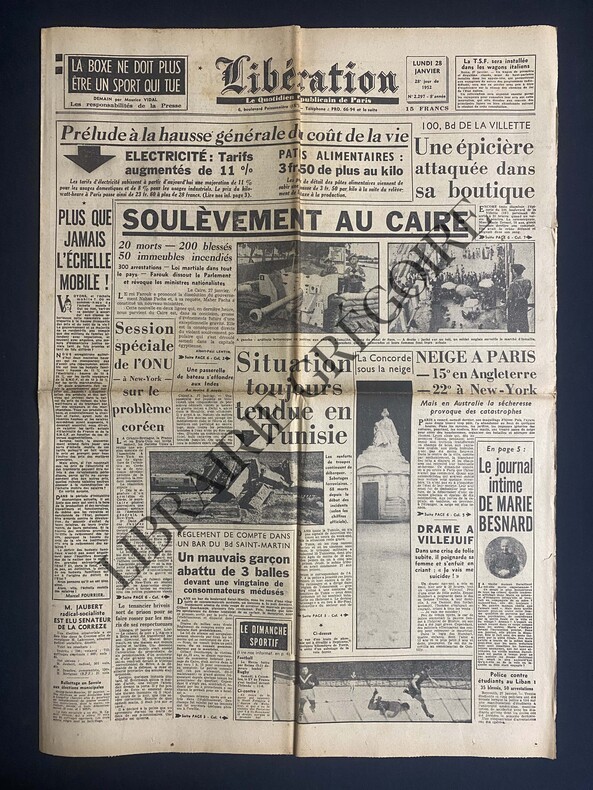 6 PAGES-43 CM X 60 CM-EN UNE: SOULEVEMENT AU CAIRE, 2 PHOTOS, SUITE P6-SITUATION TOUJOURS TENDUE EN TUNISIE, PHOTO, SUITE P3-P2: PHOTO GEORGES GUYOT, BATEAU LAVOIR-AU SEUIL DE SES 80 ANS COLETTE LA VAGABONDE POSE, MALGRE ELLE, POUR LA POSTERITE, SOUS LE FANAL BLEU, PHOTO-P4: TOURNOI DES 5 NATIONS, FRANCE IRLANDE, PHOTO-P5: HENRI MURGER A DESORMAIS SA PLAQUE 200 FAUB. ST-DENIS, PHOTO