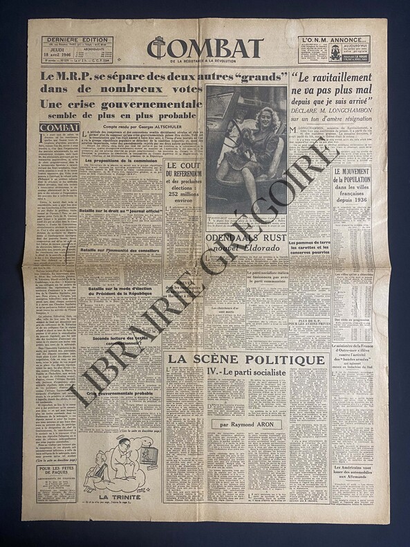 2 PAGES-43 CM X 60 CM-LA SCENE POLITIQUE IV LE PARTI SOCIALISTE, PAR RAYMOND ARON-DESSIN DE MAURICE HENRY "LA TRINITE"-PHOTO MARTINE CAROL (10 CM X 15 CM), RALLYE SOLEIL-ODENDAALS RUST NOUVEL ELDORADO-2 DECHIRURES SANS MANQUE EN PLIURE CENTRALE