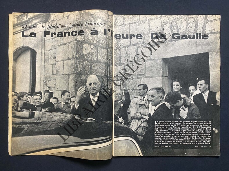 96 PAGES-26,5 CM X 35 CM-EN COUVERTURE: CHARLES DE GAULLE ET RENE COTY-29 MAI: LE FILM D'UNE JOURNEE HISTORIQUE LA FRANCE A L'HEURE DE GAULLE, 6 PAGES-L'APPEL DU 29 MAI, PAR PIERRE JEANCARD-DUCLOS VIENT OFFRIR LE FRONT POPULAIRE-DE GAULLE EN HUIT PHOTOS-SOUVENIRS, 8 PAGES-DU BALCON D'ALGER AUX FUSILLADES DE BEYROUTH LE SOMBRE PRINTEMPS DE LA MEDITERRANEE, PAR MICHEL CLERC-LE DERNIER WEEK-END DE MADAME CHRISTIAN-JAQUE, MARTINE CAROL, 4 PAGES-NIMES REHABILITE DOMINGUIN, 6 PAGES-14-18 CETTE GRANDE GUERRE III L'ANNEE DE LA VICTOIRE, PAR PIERRE GAXOTTE-PRINCE DE PIGALLE, FRANCIS CARCO EST MORT LES MAUVAIS QUARTIERS ONT PERDU LEUR POETE, 4 PAGES-BALLET EN KIMONO POUR LES ATHLETES DU MIKADO, 2 PAGES-UN MARIN ANONYME A CHOISI LE G.I. INCONNU, 6 PAGES-OULANOVA DE MOSCOU A L'OPERA DE PARIS C'EST LA DEESSE DE LA DANSE, 4 PAGES