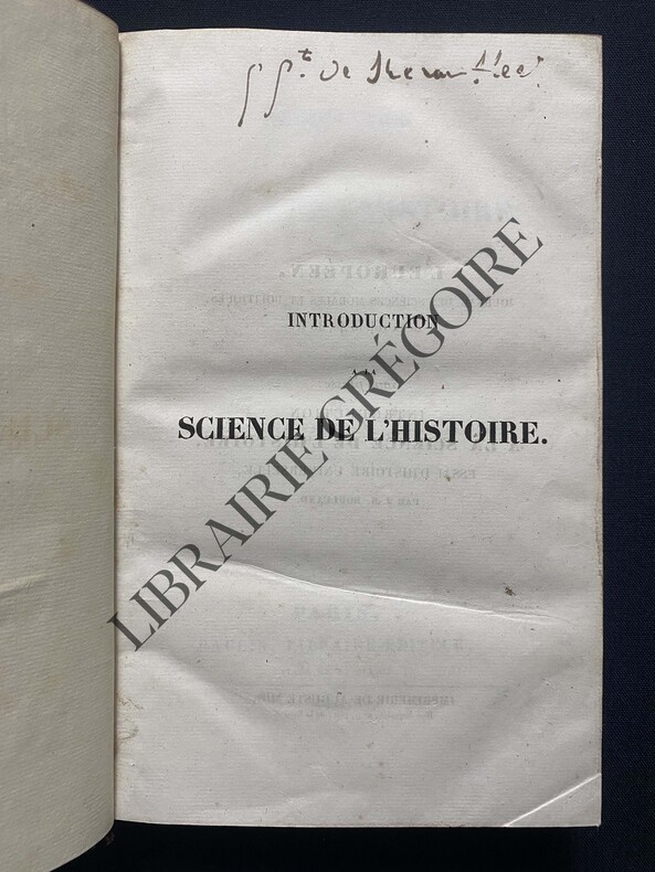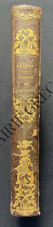 Paris, Paulin, Libraire-Éditeur, 1833. (4), 568, (4, Table des Matières, errata) pp. 8vo. Contemporary half calf, corners, marbled boards, spine gilt in compartments, label with gilt lettering. Walch 683; Stammhammer, i, p. 40; Dolléans & Crozier, p. 38; DBMOF, i, pp. 318-321. First edition. Philippe-Joseph-Benjamin Buchez (1796-1865), philosopher, historian and social reformer who from the early 1830s on attempted to draw together in a new synthesis apparently disparate traditions: the Catholic, the democratic, and the Saint-Simonian. Most historians (with the notable exception of François-André Isambert) have underestimated the originality and the importance of Philippe Buchez. Although his works are difficult to penetrate and little read, his writings contain much more than the proposal for worker's producer cooperatives and the idealistic Christian socialism for which Buchez is usually remembered. They contain, above all, his brave attempt to create a science of society -the most elaborate after that of Comte- and to understand society in a historical perspective. What sets him apart from the other socialist theorists who flourished in the Paris of the July Monarchy, is less the evolution of his thought than the synthesis he attempted. During the early years of the July Monarchy, Buchez quickly developed and propagated his ideas. He gave a series of lectures, he founded a newspaper, the Européen, and he began to publish philosophical and historical studies. He is best remembered by his concern to improve the worker's lot and his proposal for the establishment of workers' producer cooperatives. (See the elaborate article by Barrie M. Ratcliffe in the Historical Dictionary of France from the 1815 Restoration to the Second Empire). - Some scattered spotting, somewhat heavier in the first few pages of the book, small stamp in blank portion of title-page, a good copy.